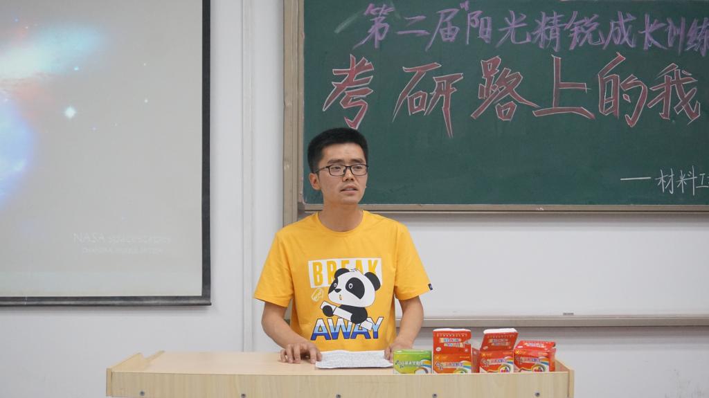 首先赵文辉以自身大学生活和考研经历分享了他的成功经验。他讲到,要想成功考研,第一是要学好公共基础课程,培养自身对专业课的兴趣,随后赵文辉建议,要在大学生活中做一些有价值有意义的利于自身成长的事,并着重强调,想要考研必须尽早准备,准备的太迟知识的遗忘率太大,那么后期的复习将会产生很大阻碍,最后赵文辉鼓励在座的学生,努力准备考研的同时要相信自己,并持之以恒的学习不能有丝毫懈怠,这样才能成功。