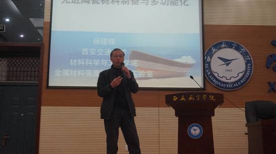 杨建锋教授以《先进陶瓷材料制备与多功能化》为题,以幽默风趣的语言和生动的例子首先介绍了陶瓷材料的分类并举例说明了陶瓷材料的重要作用。之后他介绍了有关陶瓷材料的研究方向,还讲了高性能碳化硅陶瓷及其产业化技术和多孔制备技术的研究等并分析了纳米复相可加工陶瓷与先进陶瓷相比的优势。最后,杨教授介绍了陶瓷材料的相关应用及其良好的应用前景。报告结束后,同学们积极向杨教授提出自己的问题,杨教授耐心地一一作以解答。