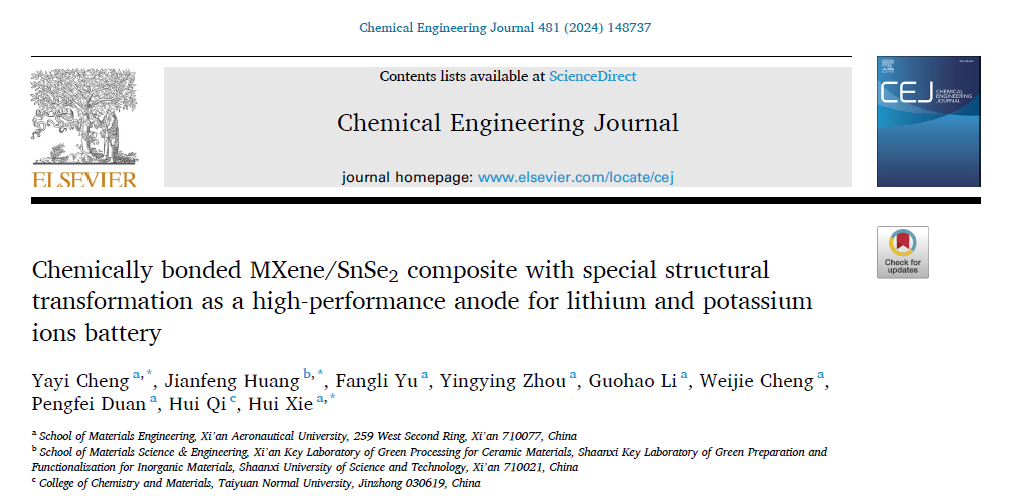 必赢242net官网教师程娅伊副教授等人最近在国际知名期刊《Chemical Engineering Journal》上发表了题为Chemically bonded MXene/SnSe2 composite with special structural transformation as a high-performance anode for lithium and potassium ions battery的学术论文,必赢官网为第一完成单位,陕西科技大学和太原师范学院是共同合作单位,程娅伊副教授为本文第一作者和通讯作者,必赢242net官网谢辉教授和陕西科技大学黄剑锋教授为本文共同通讯作者。