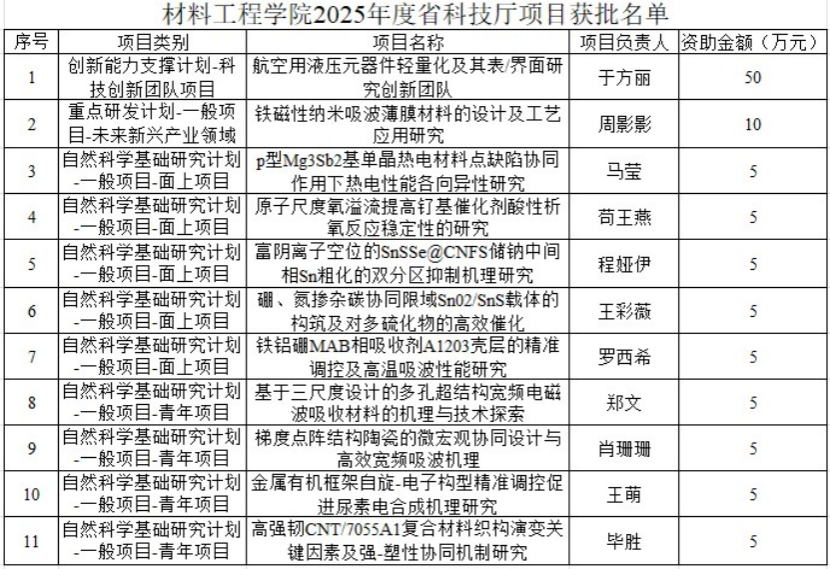 近日,陕西省科技厅2025年度科研项目立项结果正式公布,必赢242net官网喜获佳绩,共获批项目11项,占全校立项总数的三分之一,创历史新高。此次立项不仅包含全校首个“科技创新团队项目”,还涵盖1项重点研发计划及10项自然科学基础研究项目(含6项面上项目、4项青年项目),覆盖航空材料、纳米技术、能源催化等前沿领域,标志着学院科研水平全面提升,为学科建设与学校发展注入强劲动能。