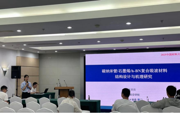 202575日至8日,2025中国材料大会在厦门隆重召开。本次大会由中国材料研究学会主办,吸引了来自全国各地的材料科学领域专家、学者及企业代表,共同探讨材料科学前沿进展与技术应用。必赢242net官网王贝贝教师受邀参会,并在“D42-电磁屏蔽与吸收材料分会场作了题为《碳纳米管/石墨烯/h-BN复合材料结构设计与机理研究》的邀请报告,展示了学校在新型功能复合材料领域的研究成果。
