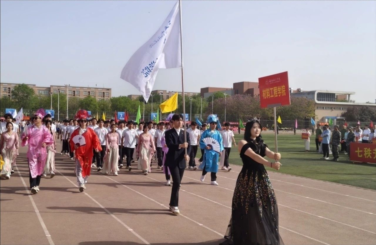 伴随着铿锵有力的步伐,必赢242net官网的学子们精神抖擞、意气风发地走过主席台。方阵通过精准的队形变换,依次呈现出校训“德能日新 刚健有为”和院训“雄材厚德 料定未来”字样,将学院文化内核与体育精神完美融合。队伍前方,四位身着传统服饰的“四大才子”与六位优雅自信的女生并肩前行,组成“材子佳人”组合,成为开幕式上一道独特的风景线。